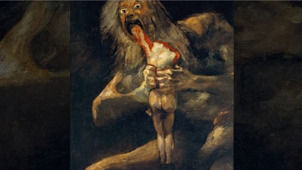 The victim’s position is equally telling. The small body doesn’t struggle or resist – it’s limp, passive, already partially consumed. This isn’t a battle but a surrender, suggesting that the younger generation has already given up hope of surviving the older generation’s destructive power. The imagery becomes prophetic – entire societies can be consumed by their own leadership, entire futures devoured by the paranoid present.